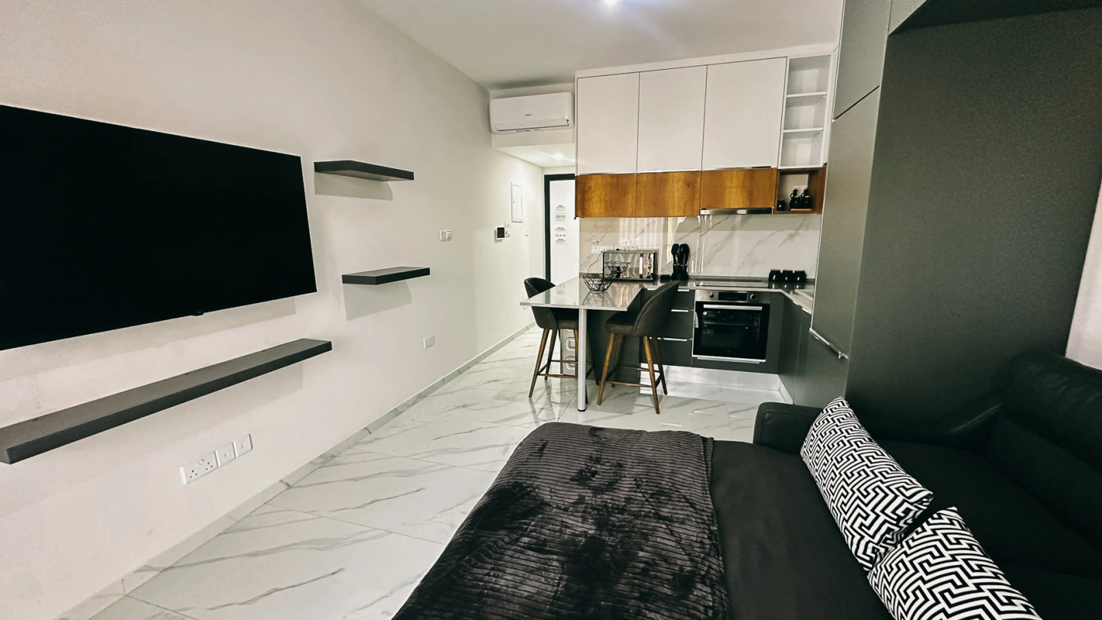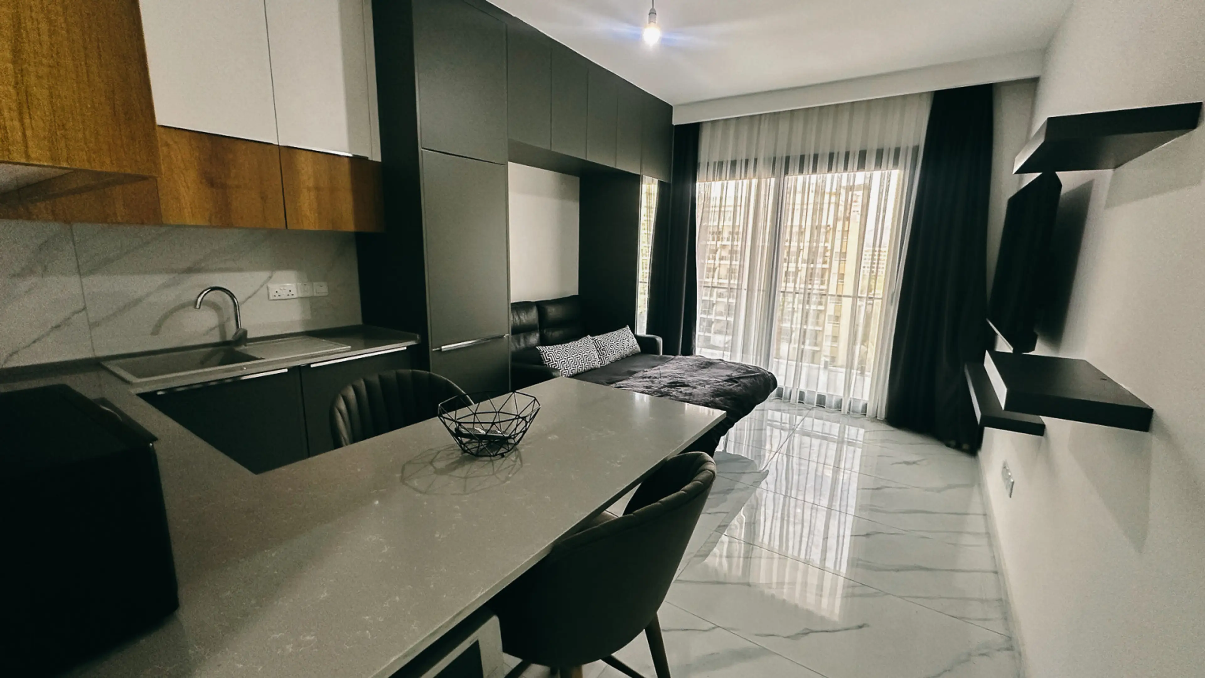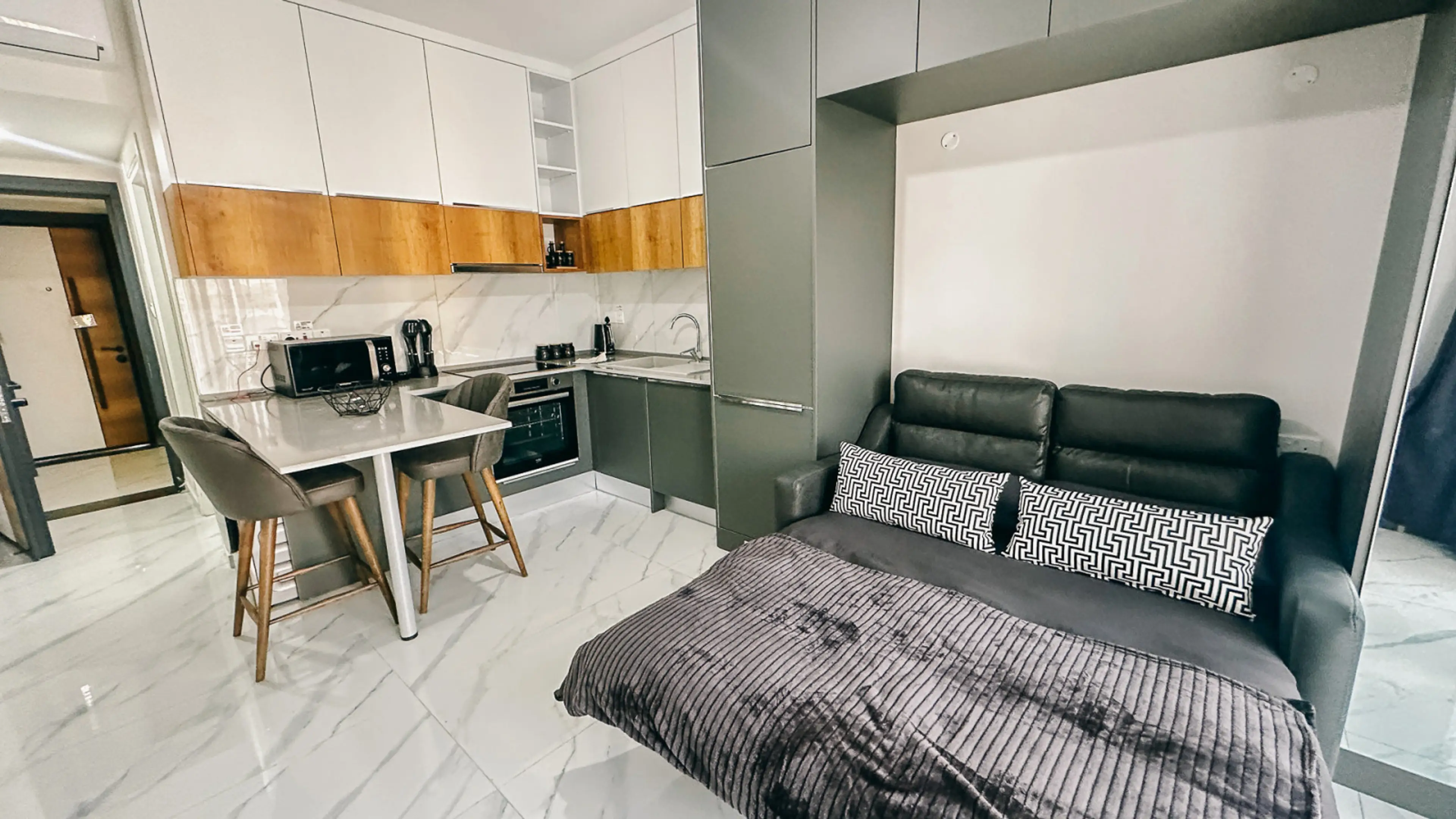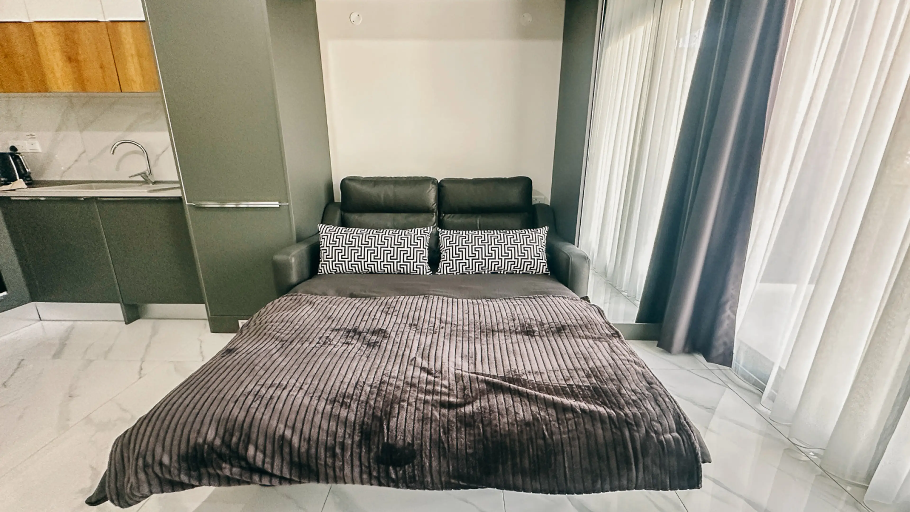 This bright and modern Studio features: Comfortable fold-out sofa for a spacious living room Open plan layout with plenty of natural light Private balcony with cityscape and sunset views — ideal for morning coffee or evening sunsets Fully equipped kitchen / kitchenette High-speed Wi-Fi, air conditi...